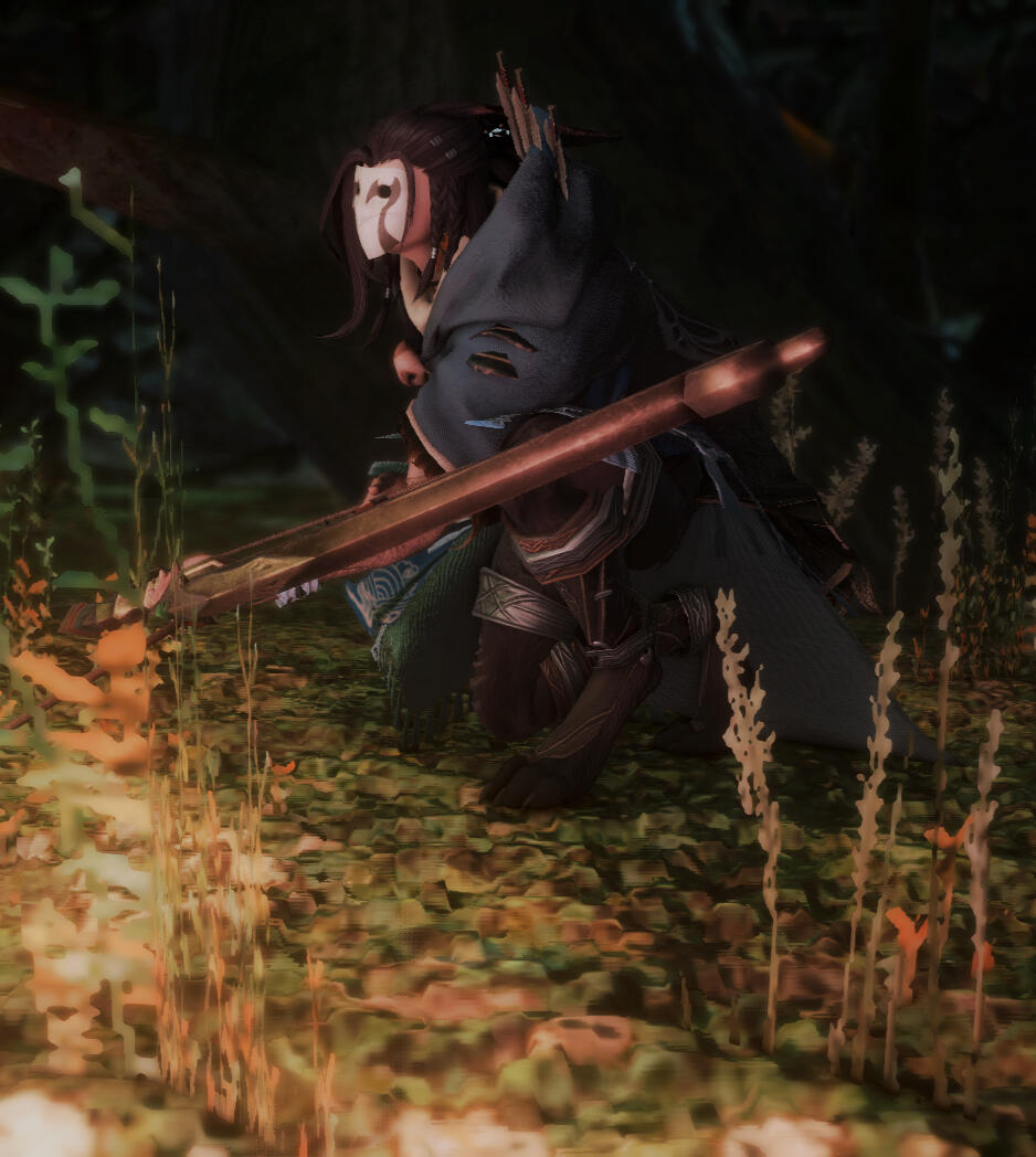 Much more obvious in immediate is the rather unsettling wailers mask that covers his face-he's more often seen with it than without, and prefers to hide himself and his reactions behind the intimidating visage-and, as well, a line of linkpearls that run along his remaining ear.